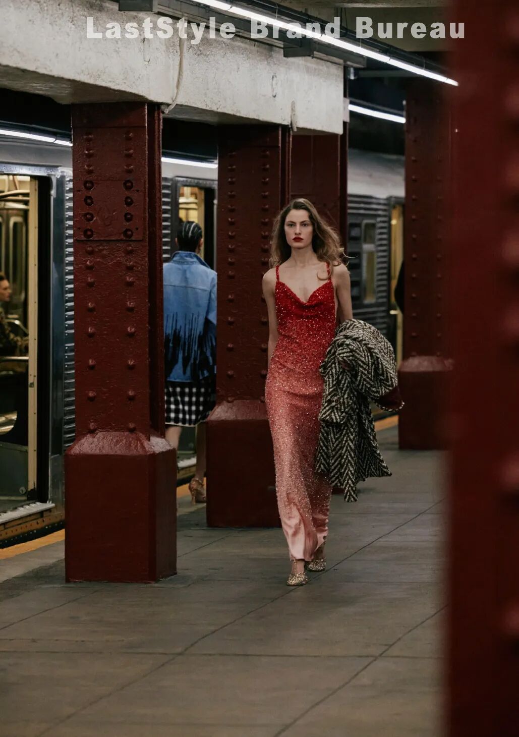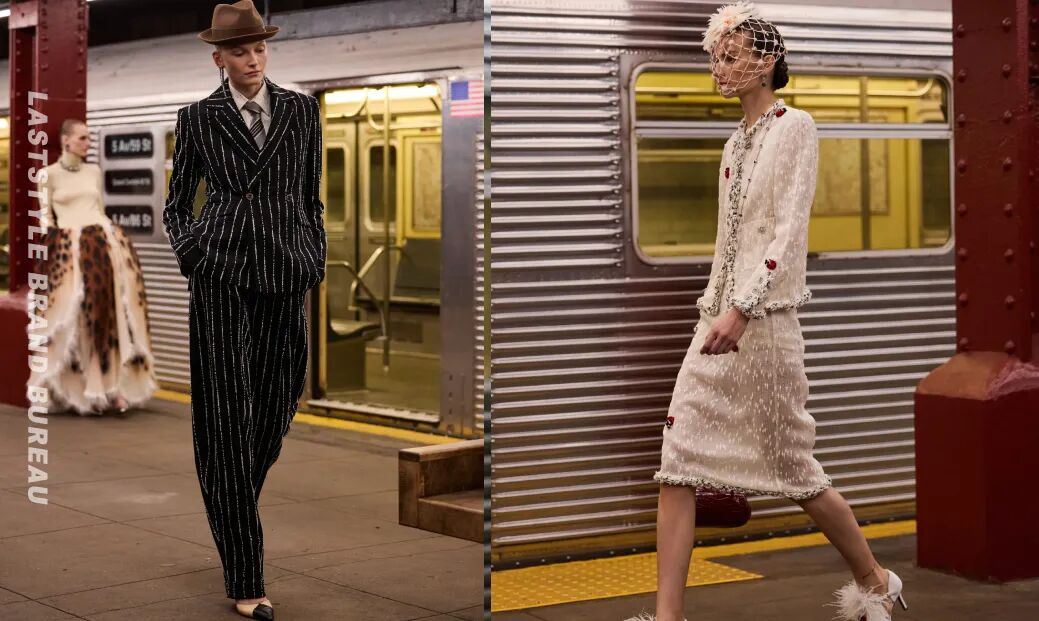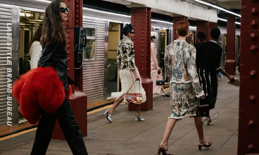 七年前,Karl Lagerfeld将香奈儿的纽约手工坊秀场设于上东区的大都会博物馆,在狮身人面像前演绎埃及传奇,仿佛一场精英主义的视觉加冕。七年后,Matthieu Blazy 的叙事舞台从神殿沉降到地铁——一个被剥去华丽滤镜的、流动的都市腹腔。