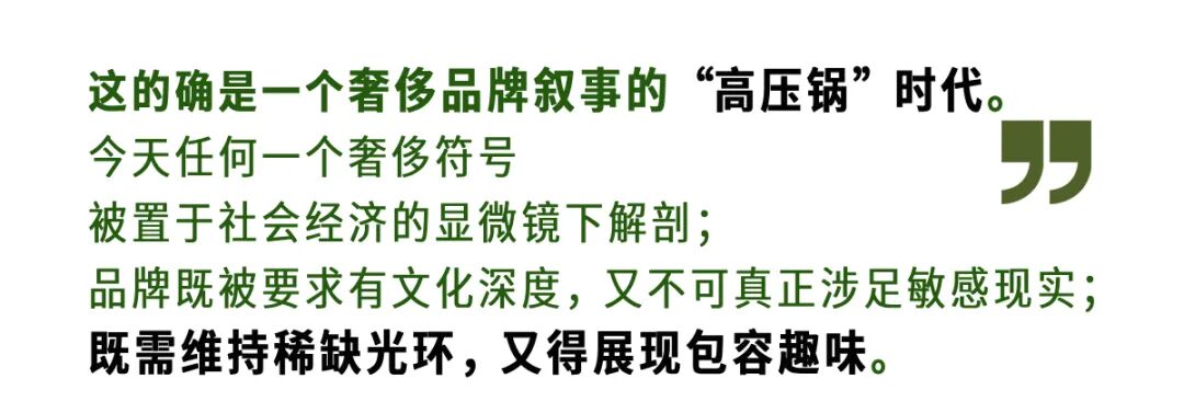 在这种社会环境之下,奢侈品牌那种高高在上的引领性逐渐没有了根基。因此走入日常几乎是必然的举措。
