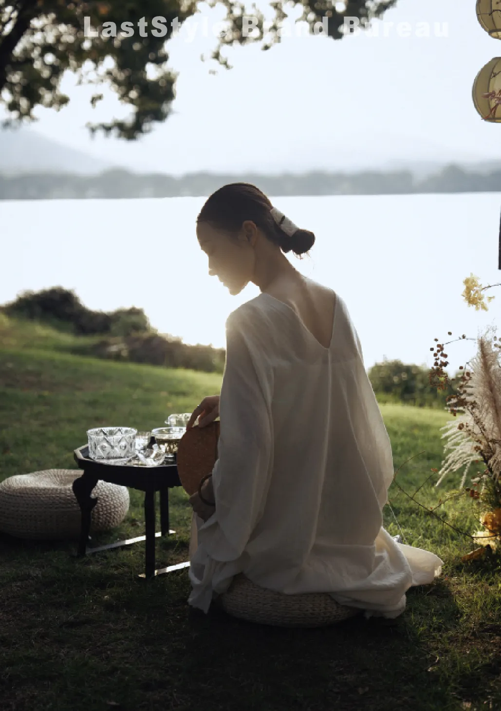 最后,视觉的高光之处,停留在西湖畔的一席茶味之上,一位身着素衣长袍的女子在湖畔的草坪,品茶制香。这颇具戏剧性的一幕,将人从日常琐碎中抽离,定格为一段纯粹的诗意画面。