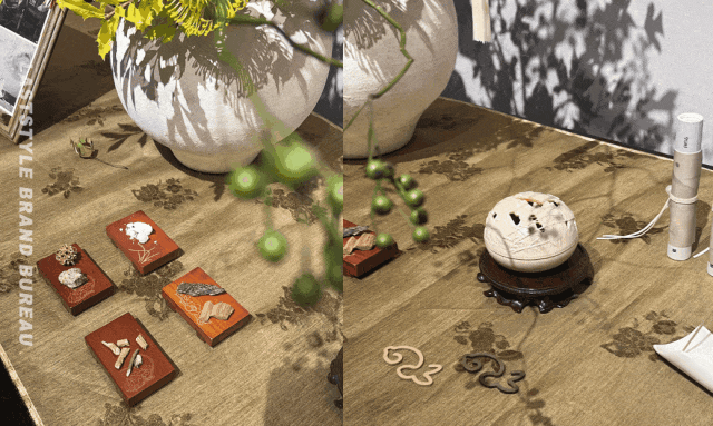 第一站我们直奔「西园茶室」, 空山时于此地呈现了卧香系列新品,形似玉兔,香气融合了红景天的温润、老山檀的悠远与龙脑的清冽。一旁陈列的香器与礼盒,也延续了品牌一贯的简约雅致。产品两侧,还摆放着印有“素月行舟”灵感来源的海报,以及取材自杭州本地的香材原料,仿佛一场微型的品牌美学展。