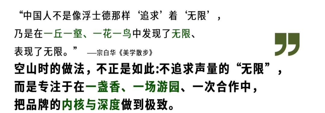 空山时的做法,不正是如此,不追求声量的“无限”,而是专注于在一盏香、一场游园、一次合作中,把品牌的内核与深度做到极致。