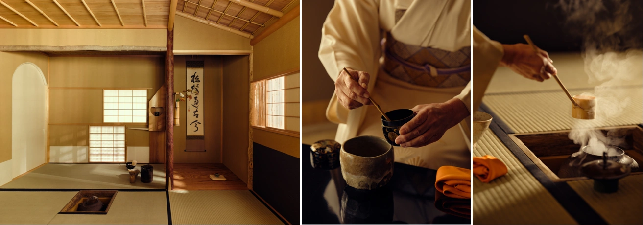 茶舍坐落于酒店宏伟亭阁周围的非凡园林之中,苔藓覆盖的石径尽头,静卧于一方池塘之畔,与安缦京都的建筑之美和自然景致融为和谐整体。茶舍内部,主持人以“款待之道(日本待客之道)”为核,演绎历经数百年淬炼的严谨仪轨,营造出和谐、尊重、纯净与宁静之境。