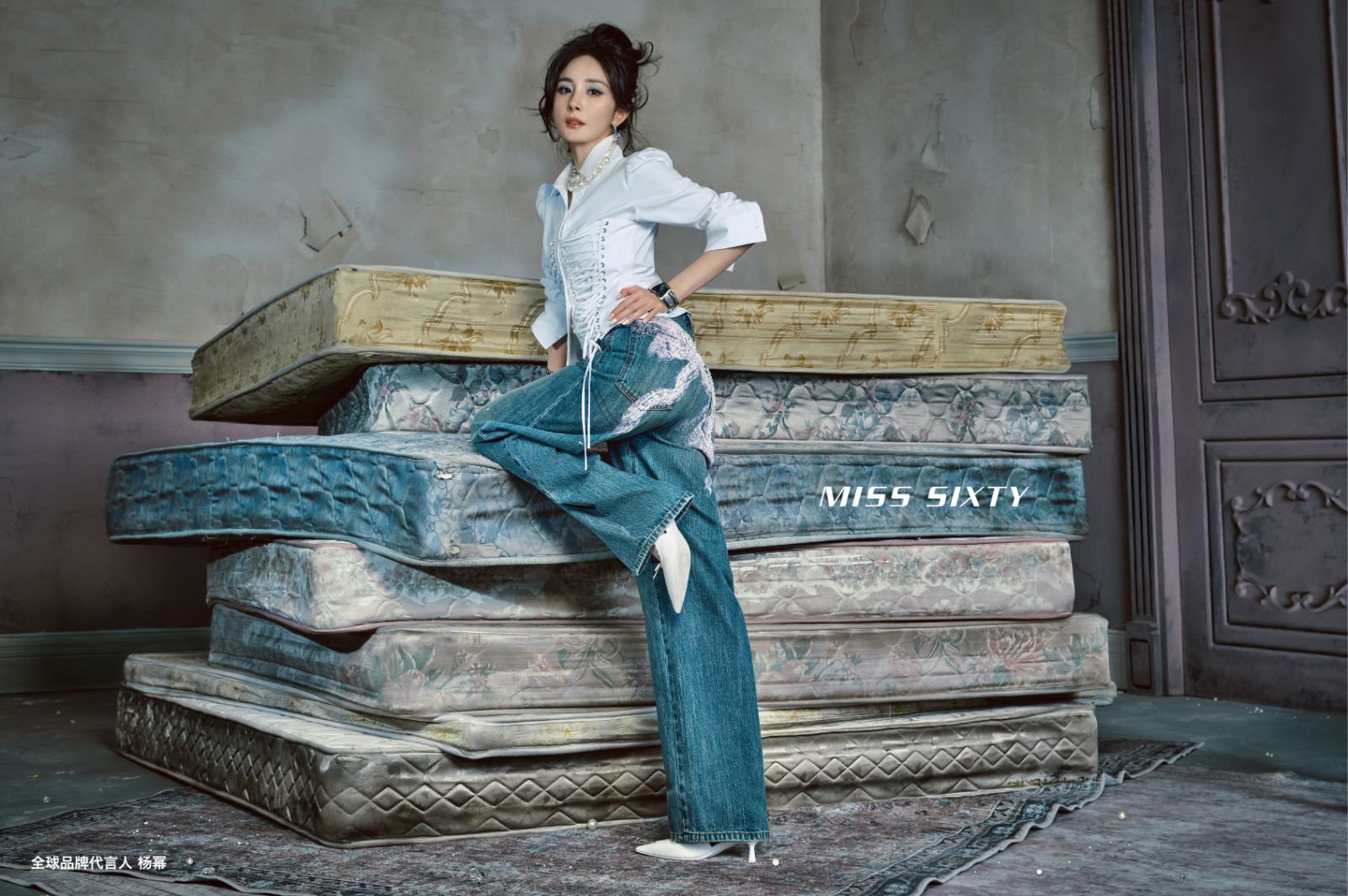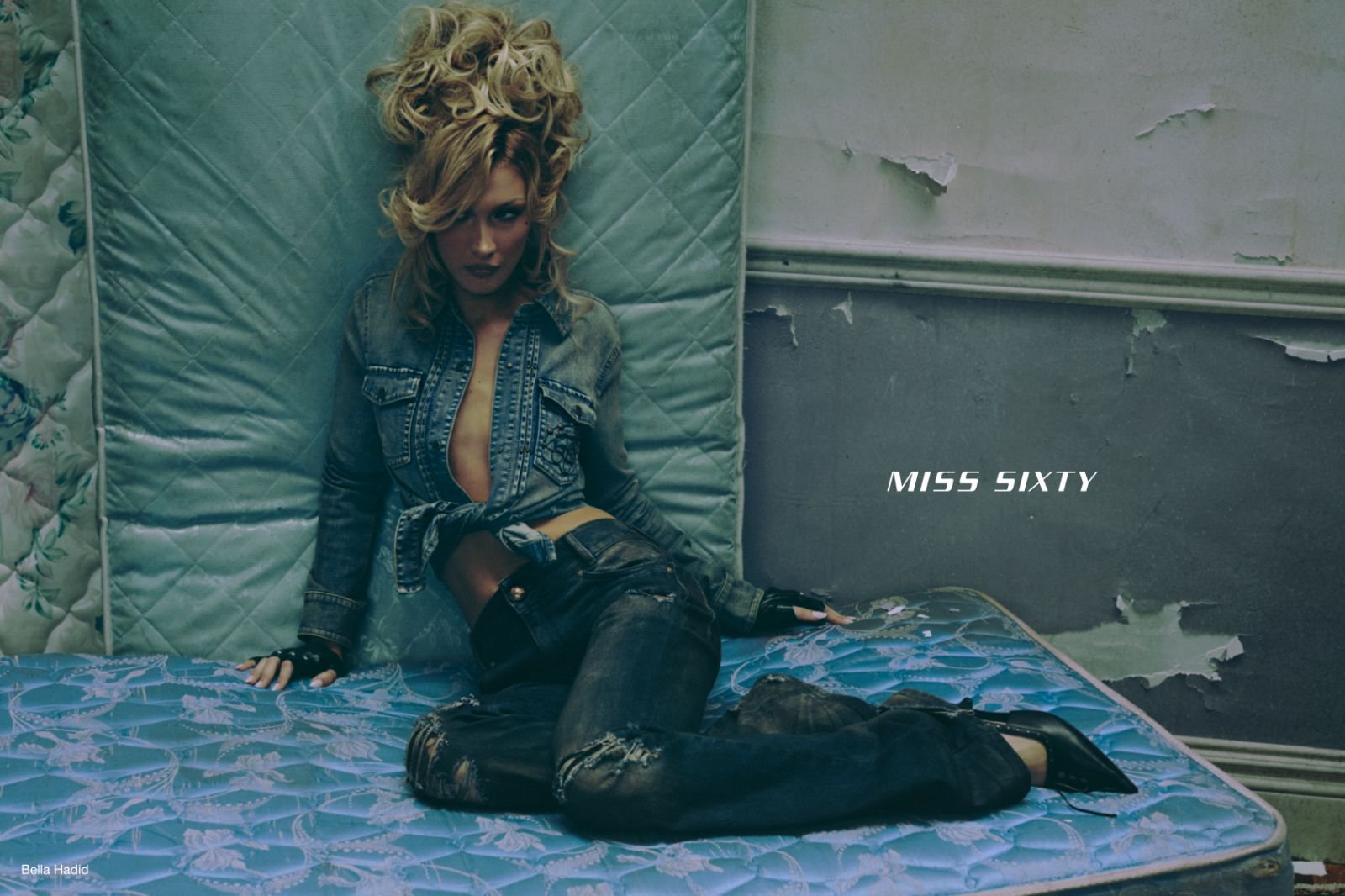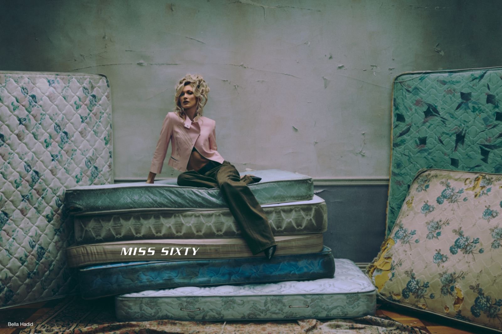 而全球代言人Bella Hadid则在摄影师Gabriel Moses的忧郁氛围镜头下,化身当代版玛丽·安托瓦内特(2026春季MISS SIXTY设计灵感来源)。不同于传统印象中洛可可奢华的脆弱符号,她以叛逆姿态打破时代的桎梏,在重构的“洛可可废墟”场景中完成自我表达,一座想象中的宫殿已沦为废墟,华丽又繁复的装饰成为过往的遗迹,层层叠叠的床垫之间,仿佛置身于《豌豆公主》的寓言故事中,凡尔赛水晶吊灯与法式奥斯曼装饰框定出一个浮华崩塌、叛逆生长的精神空间。在Bella的演绎中,柔美与颠覆激烈碰撞,她以朋克式的不羁锋芒重新解析玛丽皇后的现代意象,将MISS SIXTY的反叛精神完美诠释。