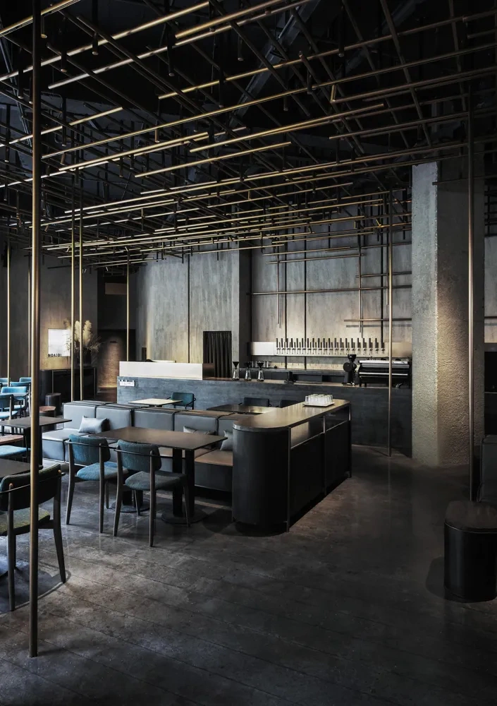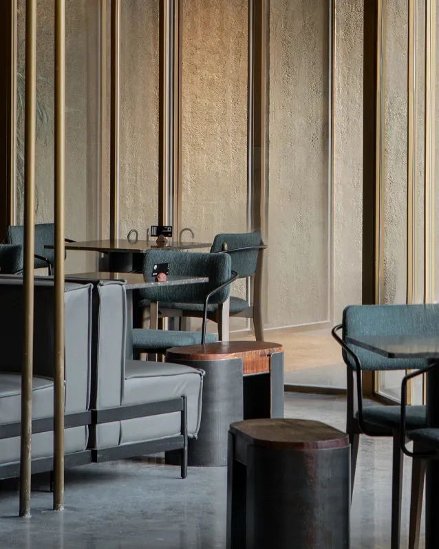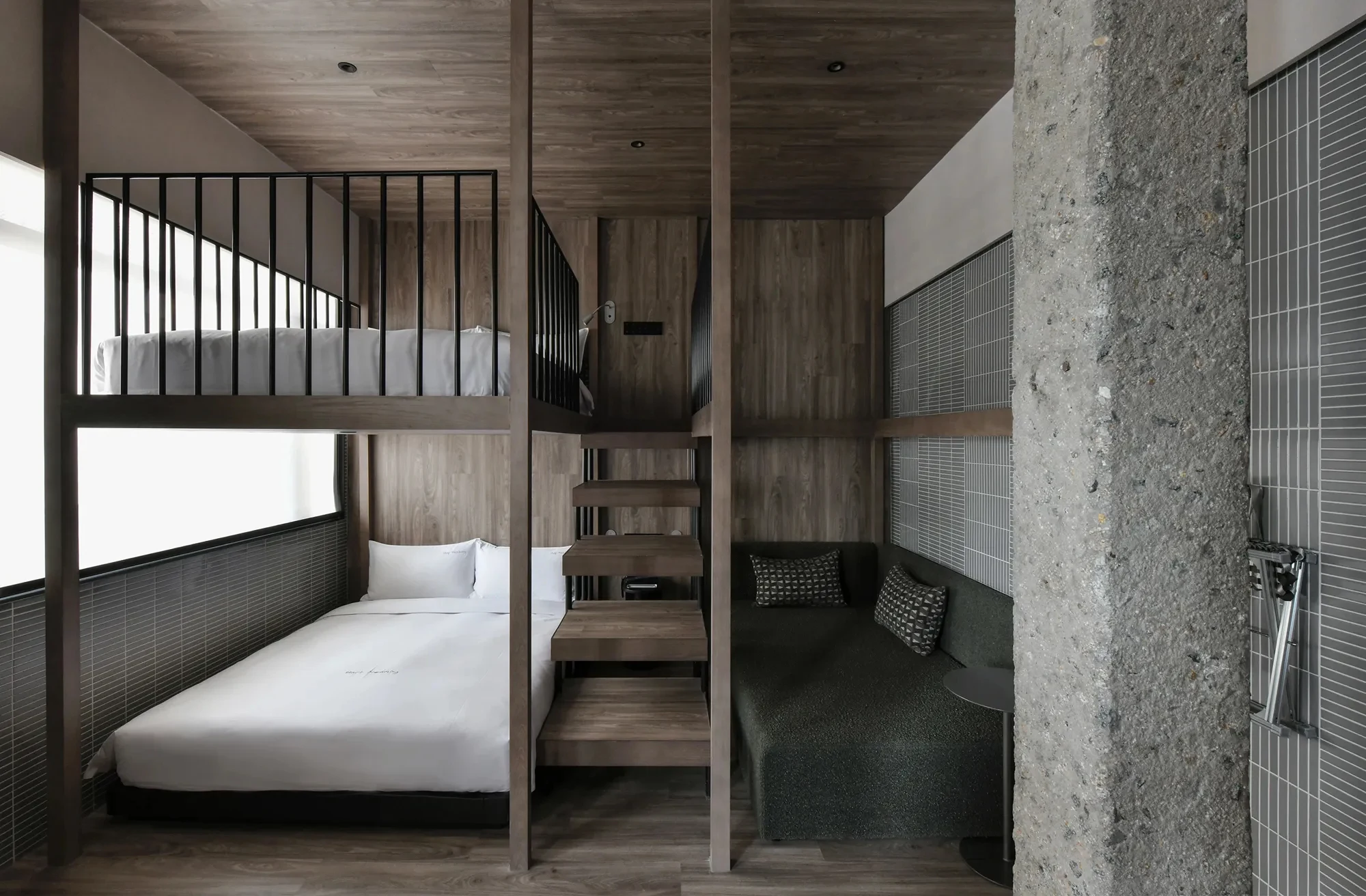 酒店整体设计由著名设计师Leo Li李泷操刀,以深圳早期采石矿区与工业发展为灵感原型,将“采石场”这一城市记忆转译为空间语言。通过斜面切角、砂岩肌理墙面及错落金属横杆的视觉语言,构建出一个抽象而诗性的城市记忆场所,致敬这座城市开山填海、蓬勃生长的拓荒精神。原有工业货梯井道被完整保留,作为贯穿建筑的重要垂直轴线,使工业遗存与当代设计在同一场域中并置共生。