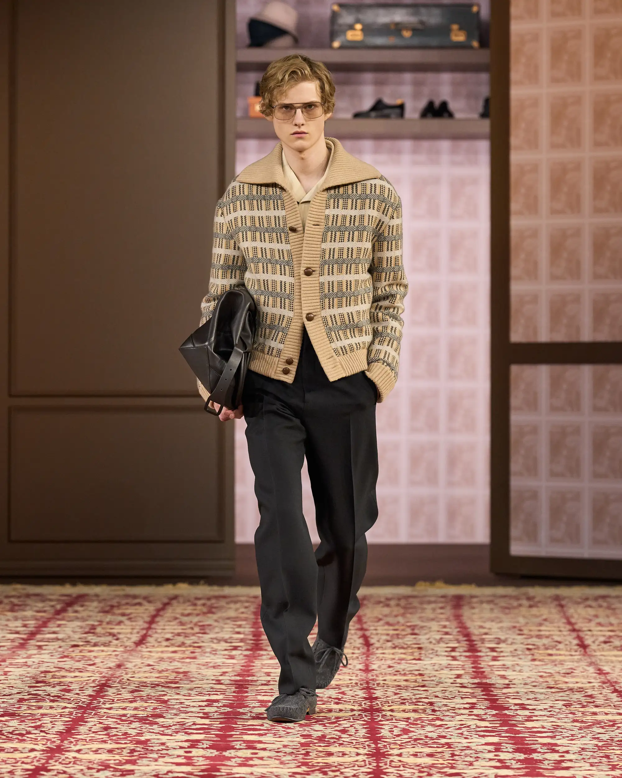 在杰尼亚 2026 冬季系列中,图案化设计元素贯穿于饰以皮革细节的立领西装、绗缝皮革马甲与飞行员夹克之中。配饰则包含适宜户外穿着的麂皮、羊毛及正绒面革材质Mocassin乐福鞋及平底鞋,彰显非凡格调;方框眼镜、毛毡内衬皮革雨帽,以及慵懒风格的旅行袋与公文包点缀整体造型,重绘风格新篇。