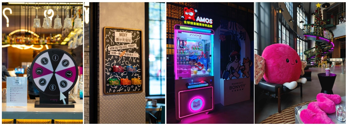 “玩乐糖果季”在参与活动的Moxy酒店中演绎出不同城市趣味:上海普陀Moxy酒店在石库门建筑中融入糖果元素,碰撞海派复古与甜蜜活力;苏州姑苏Moxy酒店于苏州古典园林咫尺之遥处,营造一场古典雅趣与当代甜酷碰撞的新年玩法;重庆Moxy酒店邀宾客在29层的360°全景旋转餐厅一边欣赏解放碑繁华景致,一边细品新年限定糖果鸡尾酒;宁波老外滩Moxy酒店以港口工业风融合糖果的柔软甜趣,将三江交汇的璀璨夜色尽收眼底。深圳北站Moxy酒店大堂将化为“甜趣游戏厅”,为旅途注入即兴快乐。