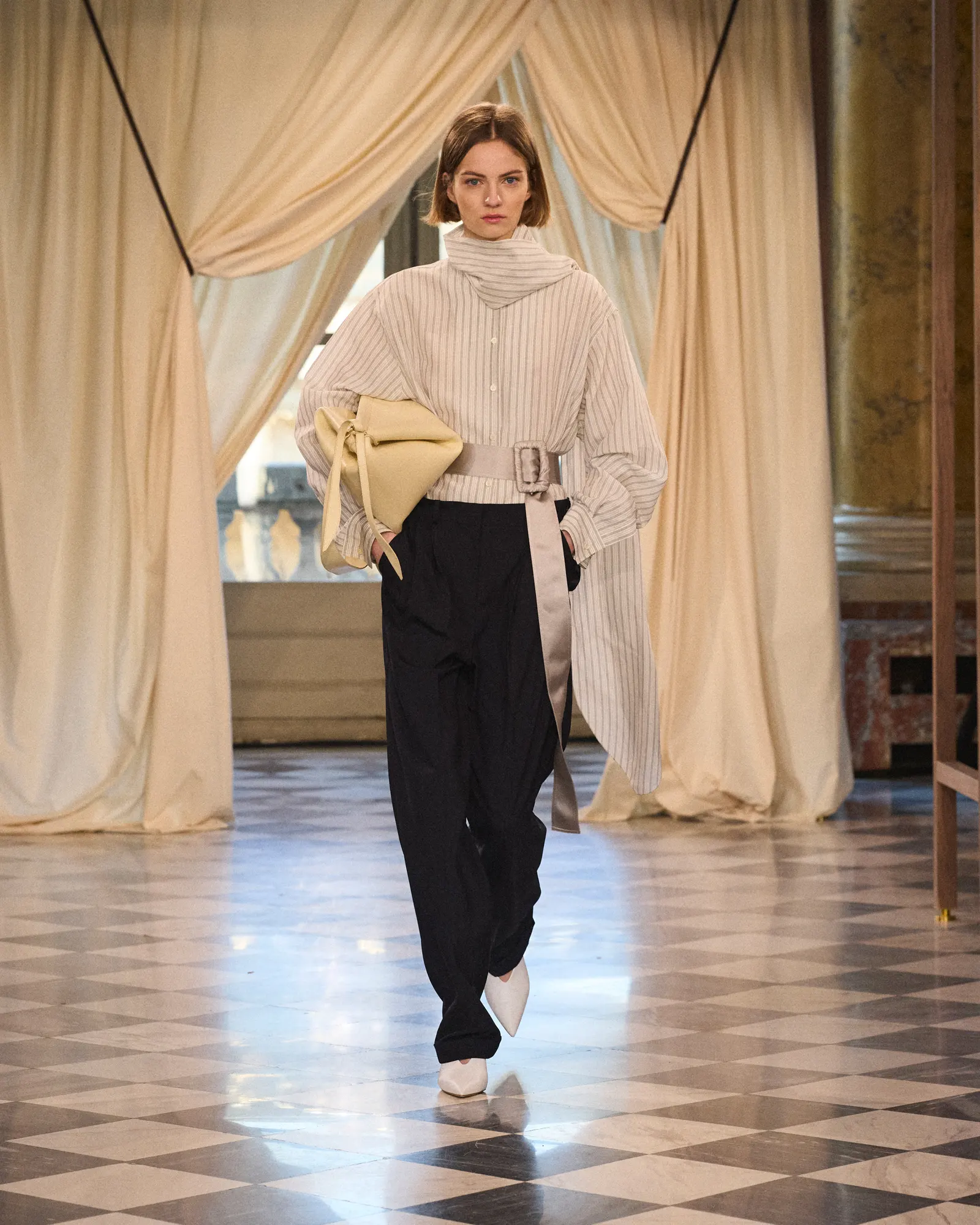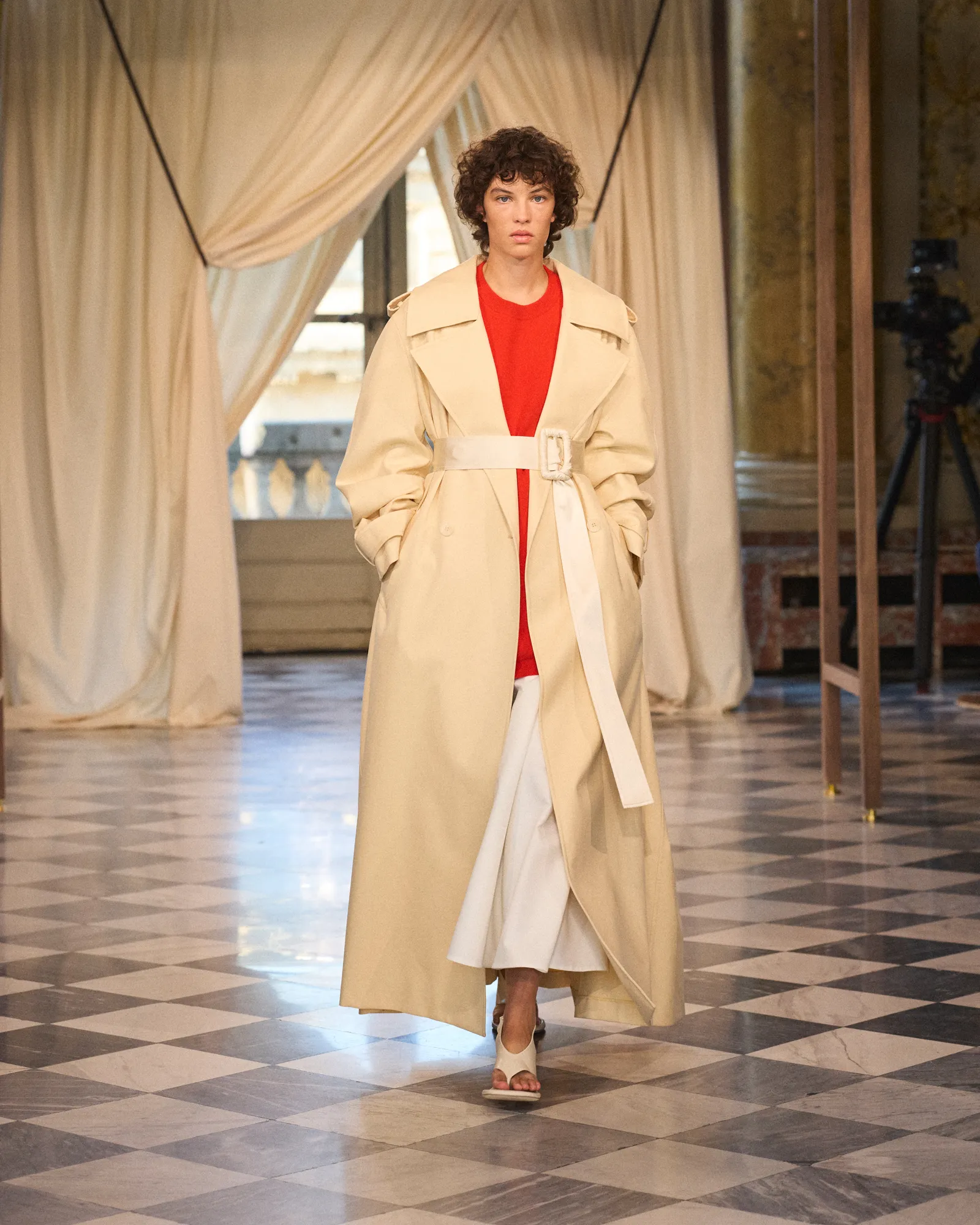 在创意总监Bénédicte Laloux的构想下,本季春夏系列以流动的天然材质,捕捉微风的痕迹。面料轻泛波纹,材质于气息间塑就其形。受简约几何图形启发,量感的打造形诸窗的构建,探索矩形、圆形与方形的极简本质。垂褶、收褶与裥褶,令廓形始终处于流转变幻中。