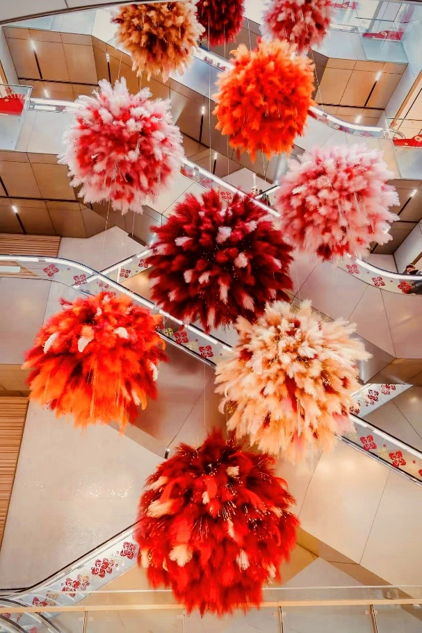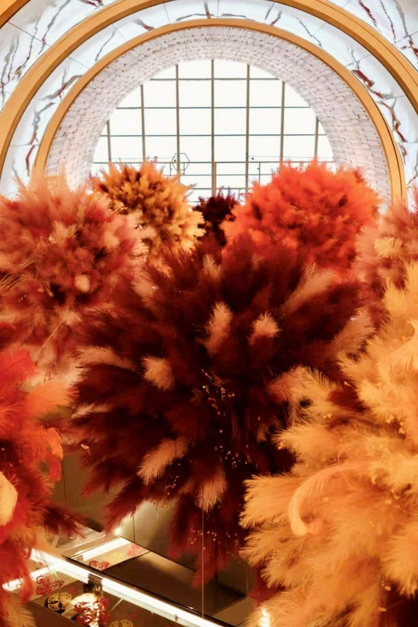 推开上海芮欧百货的门,便踏入了 “白昼里的春焰”—— 春节花火被凝练为 “白日烟花” 艺术形态,织入空间每一寸光影,让年味化作可触可感的温暖诗意。中庭抬眸,凌空舒展的花艺团簇是视觉核心:暖金线条勾勒柔软轮廓,红褐与暖橙色调层层漾开,宛若烟花绽放的绚烂瞬间被定格成静美画卷;羽毛与金纹交织的肌理间藏着温润触感,将烟花的热烈,调成芮欧独有的静谧精致。