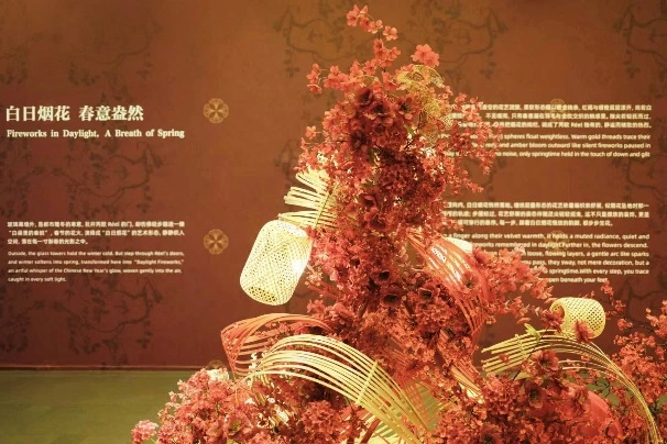 沿通道漫步,“白日烟花” 悄然落地:缠绕层叠的花艺依编织条自然舒展,复刻烟花坠地的轻缓轨迹;步履经过时,花艺随足尖摇曳,成为可穿行的春序,每一步都踩着烟花慢放的韵脚,实现 “抬眼烟花、步履春意”。这场装置打破传统节庆装饰的浓墨重彩,以东方审美为骨、现代时尚为韵,契合芮欧精致时髦的品牌调性,点亮静安的新春夜空。