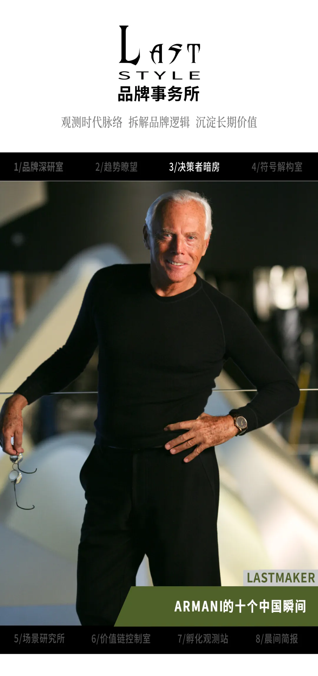 二十年后再回看,Armani 仍然是我们在参与正式场合,想要挑选一套行头时,首先在脑海里蹦出来的品牌。它的品牌价值与中国社会的发展同构,几乎成为“经济上行期”的某种遗存。