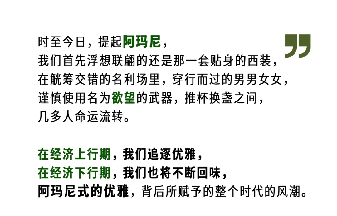 时至今日,提起阿玛尼,我们首先浮想联翩的还是那一套贴身的西装,在觥筹交错的名利场里,穿行而过的男男女女,谨慎使用名为欲望的武器,推杯换盏之间,几多人命运流转。