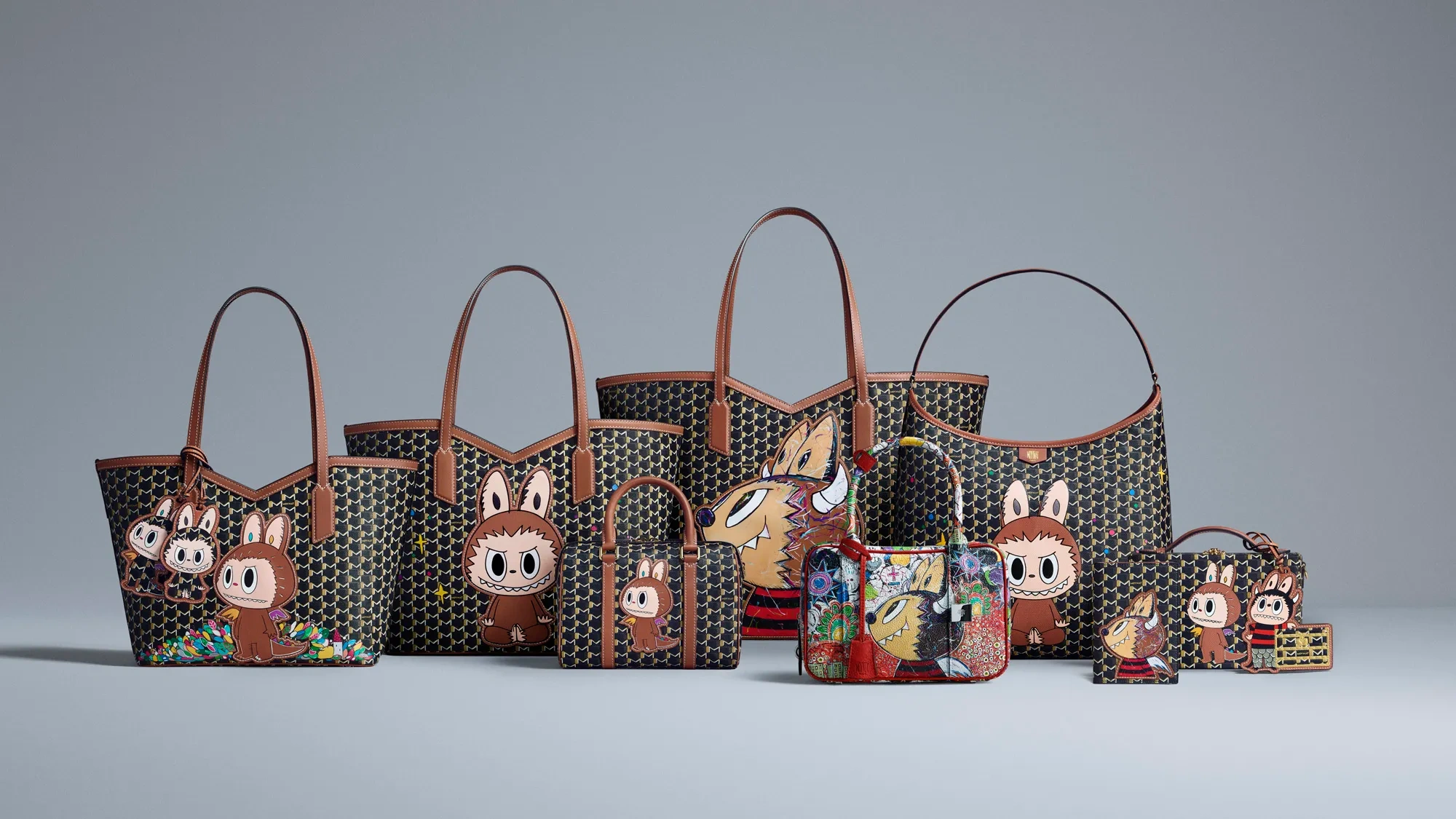 产品阵容涵盖Hobo手袋、Mini 48h手袋、Little Suitcase手提包,小号、中号和大号托特包,以及护照夹、卡包等小型皮具。此外,系列还包括一款名为Mignon的可定制手袋,饰以2024年插画图案,以及多款以Labubu等角色为主题的挂饰。设计提供蓝色、绿色、橙色、红色、黄色和经典棕色可选。