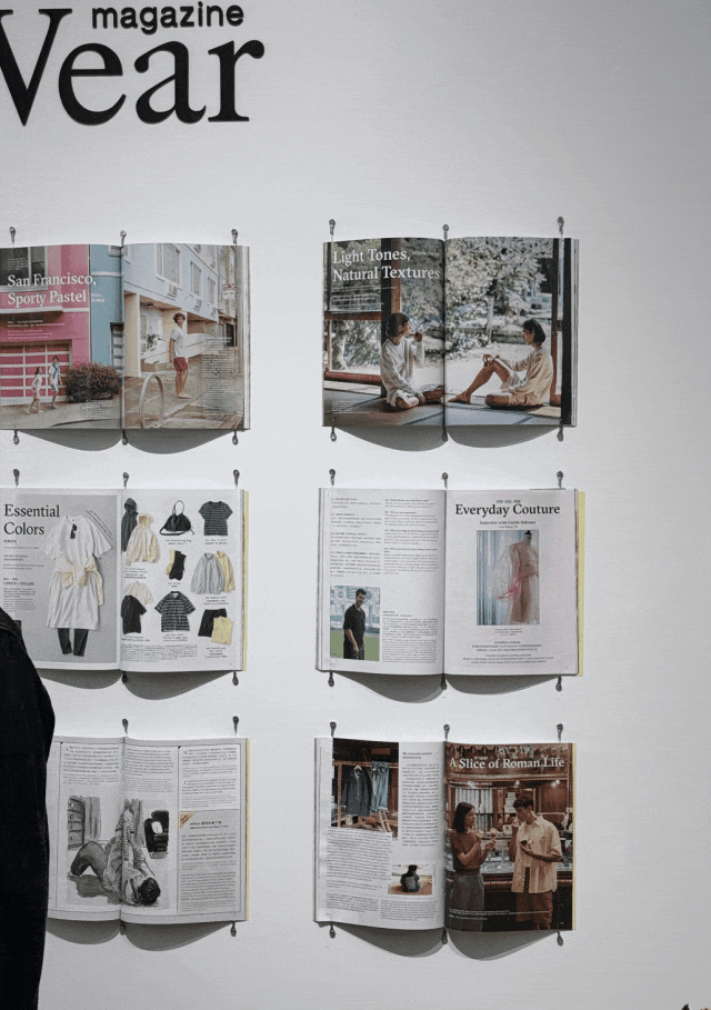 这次春夏系列展会现场有一面墙,陈列着本季的《LifeWear服适人生》品牌册。我站在那里翻了几页,这一期的灵感来自旧金山和罗马——旧金山那些粉彩色的维多利亚式建筑,罗马街头的Vespa摩托车。