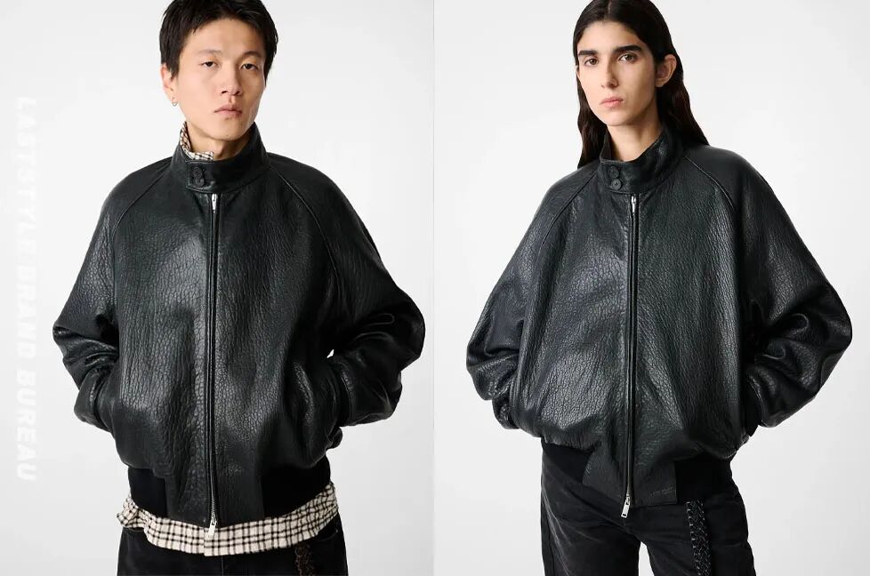牛仔、皮衣、风衣是主要品类。黑色、棕色、蓝色、米色构成了低饱和的主色调,偶尔出现的一两抹红色,营造了丰富的视觉感受,而细致打磨的钢质拉丝工艺背景,则为温润的暖意又带来了一种冷硬的质感。