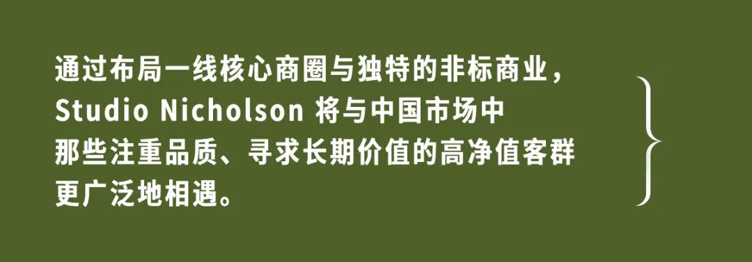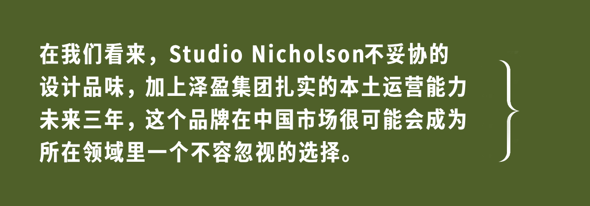 在泽盈集团创始人&集团总裁王海青(Oscar)看来,Studio Nicholson是一个典型的“小众中的大众”品牌——其审美是精准、小众的,但产品却根植于风衣、牛仔裤、精纺西装等经典基础款。这种特质,尤其是在经济周期波动、消费者预算趋于理性的当下,往往意味着更稳定和广阔的增长空间。