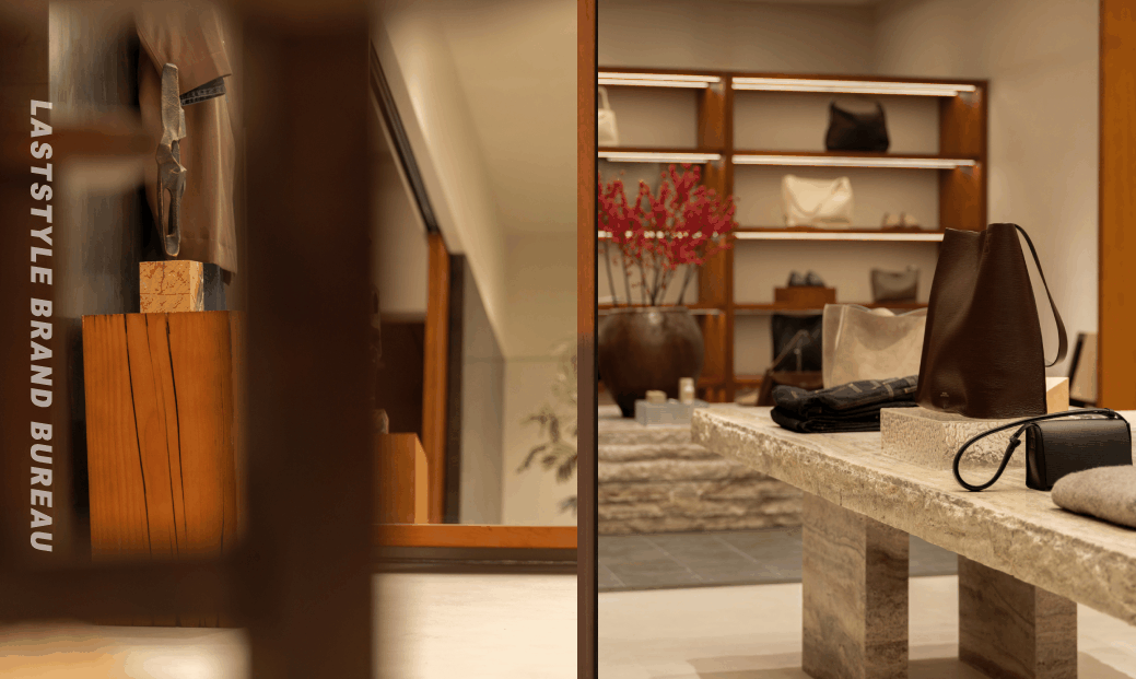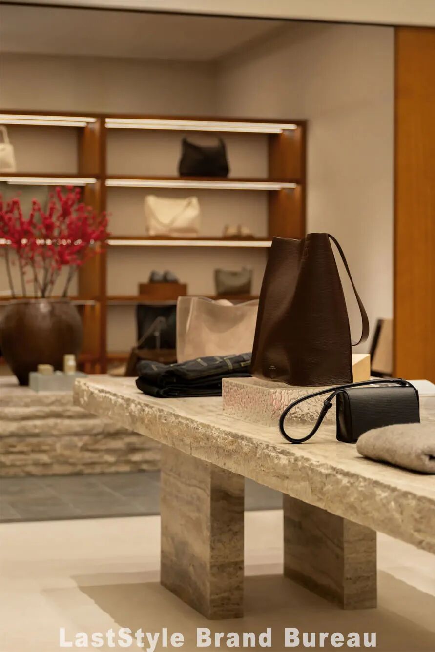 继续往里走,仿佛经过一扇无形的门。两侧摆放着一株绿色植物和一张竹编藤椅,像是一个小小的停顿。再往里是配饰区,陈列着托特包和经典鞋靴。这里的氛围更私密、安静。温暖岩板砖、天然樱桃木底座、波纹玻璃和石器陶作互相映衬。波斯合欢树的枝叶从角落自然延伸出来,一些红色点缀和黄铜摆件,增添了如私人收藏般的品味。