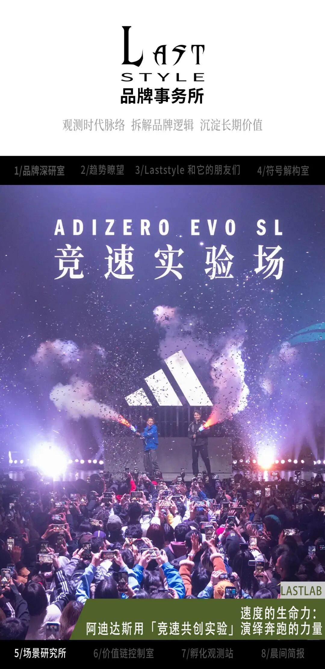 值得指出的是,这一次,阿迪达斯选择的锚点不只是 adizero EVO SL,更是一种潮流趋势——「竞速美学」。运动品牌主动定义一种时尚风格,并围绕概念搭建完整链路,试图建立品牌在时尚领域的话语权,这很少见。这种「先文化价值、后产品体系」的做法,考验的是品牌把握时尚周期的能力和系统性协同的能力。
