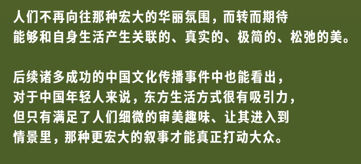 当然,这也与中国市场对于东方文化的理解转向有关。最近几年,显而易见的是,年轻人对所谓“新中式”和“东方文化”的理解,已经逐渐摆脱了西方评价体系。他们真正在意的是——这种美能否带来独特的体验感,能否让人感受到传统审美与当代生活之间的真实关联。