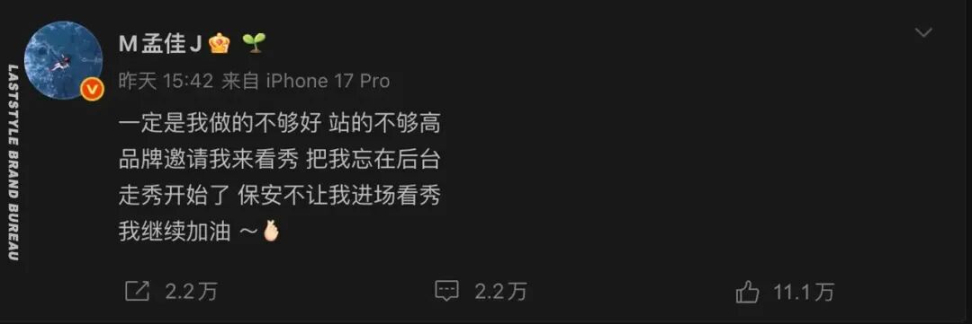 再看这次孟佳秀场被拦事件,在一个消费者往往先认识明星、再认识品牌的时代,既然品牌选择了用明星流量来换取关注度,就应用专业的流程来承接这份关注。