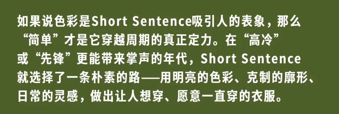 2015年正是奢侈品牌在中国市场最风光的时候,街头风潮也尚未退去。在那样一个“越大牌越好”的时期,Short Sentence选择了一条完全相反的路:做日常的衣服,融入普通人的生活。