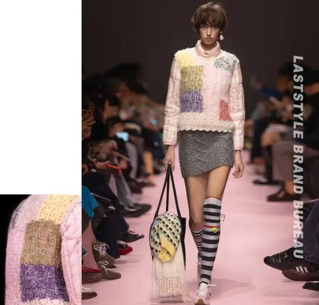 此外,一件淡粉色的毛衣马甲我私心很爱——它的灵感来自皮皮的百家布被子,在牛仔夹克、棉服、连衣裙上,格子与条纹面料如积木堆叠,保留了手工感的细节。