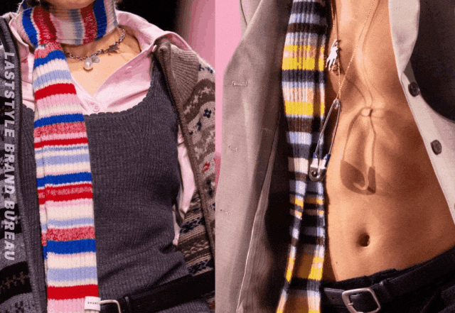 从手袋中倾泻而出的条纹围巾像是某种秘密信号;