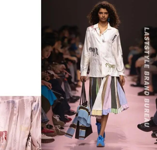 了解了这些,也就不难解释为什么这一系列的手绘波点马印花保留了儿童画的稚拙笔触,在斜纹真丝上呈现抽象趣味。