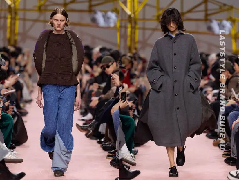 剪裁上,品牌一贯擅长的毛边、嫁接领型、格纹切割等解构细节打破了传统职场装的刻板秩序。色彩以炭黑、深海军蓝等沉稳色调打底,融入赤陶土与鲜亮色块。