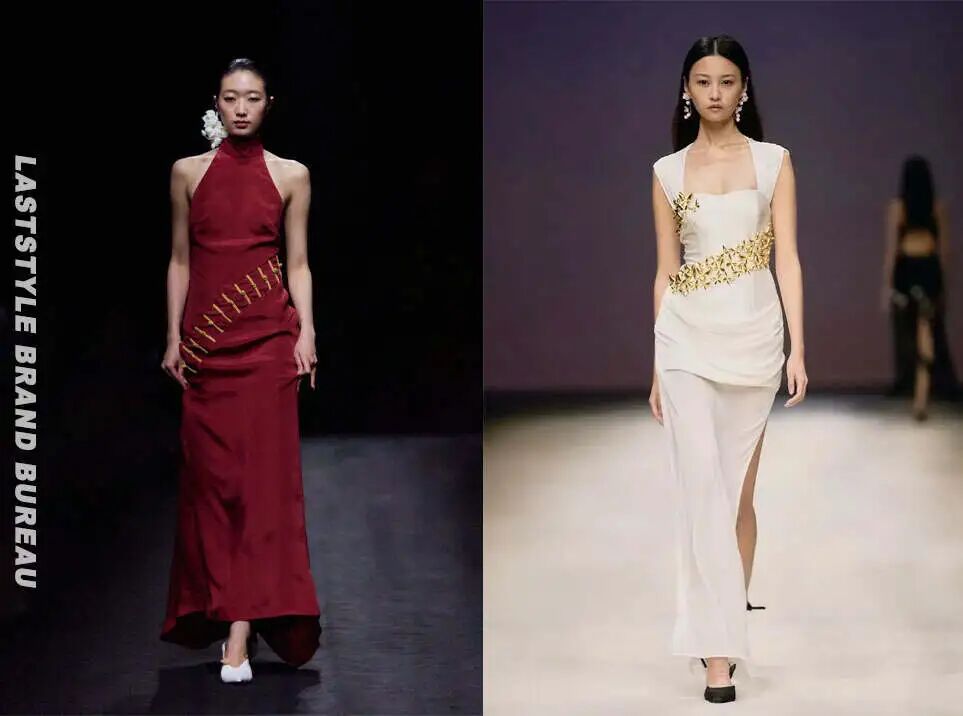 此外,一个让我倍感惊喜的小细节是,这一季与上一季的某些作品有种互文的关系,比如一件经典连衣裙从腰间斜切而下延伸至臀部的装束,上一季的腰带缠绕着金属花,这一季的排扣则形如玉竹。