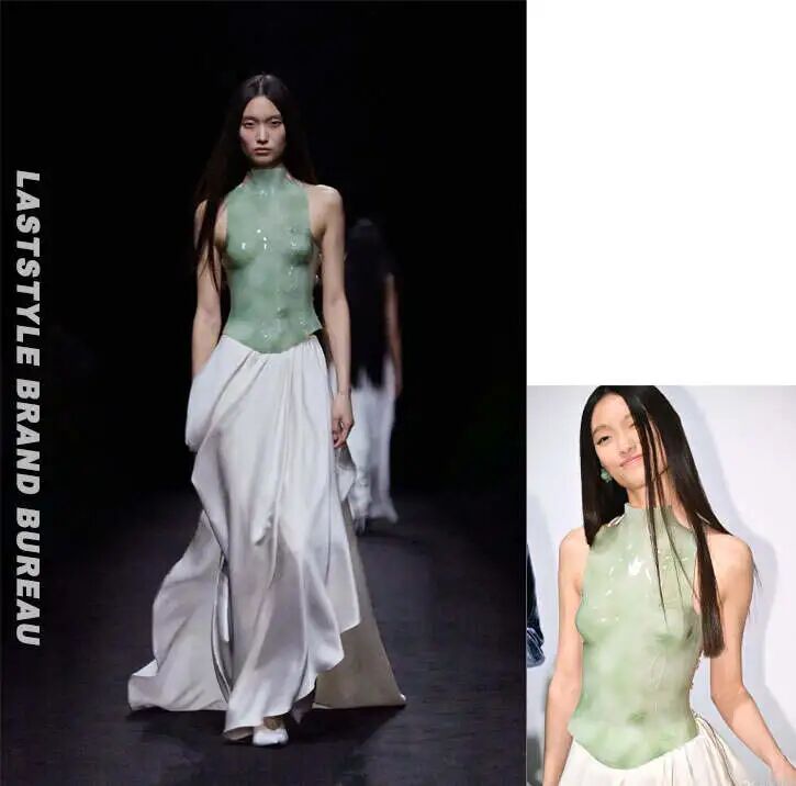 其中一件与玻璃艺术家申昊合作的作品尤其引人注目。以高温塑形与微叠层工艺重塑植物形态,打造出半透明的花艺雕塑。黑暗之中,那件青绿色的高领上衣呈现出一种「池塘生春草」的美。