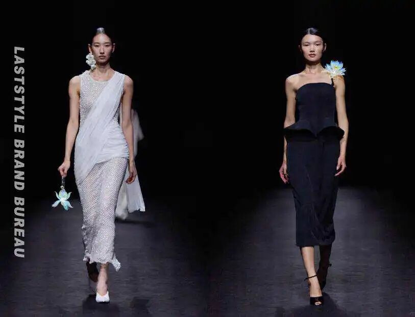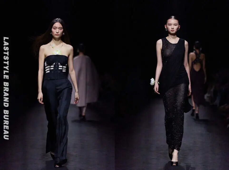 而我私心很爱的抹胸黑丝上衣搭配黑色真丝阔腿裤,再配上模特颈部的莲花配饰项链,让人想到夜晚窗边的莲花,在无人处依旧绝美,“寒塘鹤影,冷月花魂”;还有一件黑色连衣裙晚装,通过材质的堆叠呈现出八九十年代的复古迪斯科风情,与刚过去的巴黎时装周的趋势暗合。