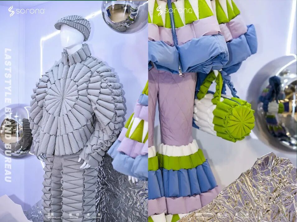 当含SORONA®生物基材料的面料以其柔韧绵感与自然弹性,结合SORONA® Aura填充材料的蓬松保暖特性,在设计师手中化作马赛克结构的装饰画、外套、裤装与包袋。