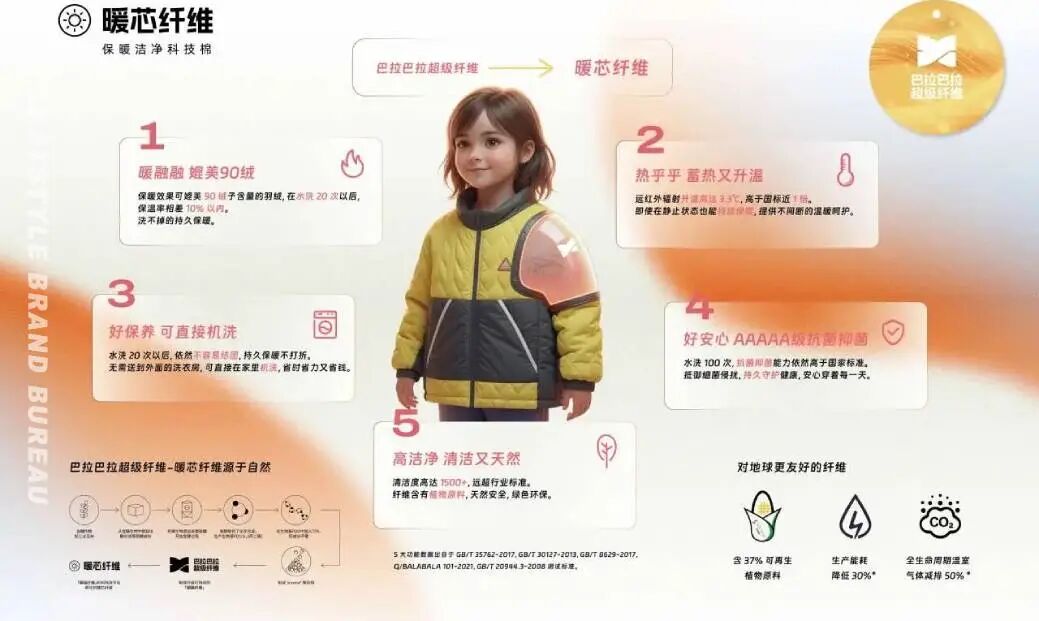 2025年10月,国内童装巨头巴拉巴拉与SORONA® 携手发布纤维级别科技 “Q弹纤维”。在发布纤维级别科技 “Q弹纤维”交流体验会,巴拉巴拉材料研发高级专家Andy用一件“暖芯纤维”制成的保暖填充棉的巴拉巴拉“暖芯科技外套”,结合“蓬松效果实验”、“保温效果实验”、“水洗不结团实验”三大互动实验,为现场嘉宾详细介绍了 “暖芯纤维”的优势所在。