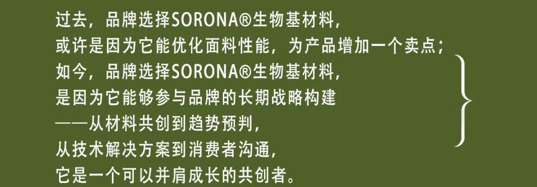 SORONA®品牌致力于将生物基材料变成人人都能穿得起的材料,让人们舒适且体面地站在人生的关键场合。不是高高在上的技术炫技,而是让好材料真正走进普通人的生活。